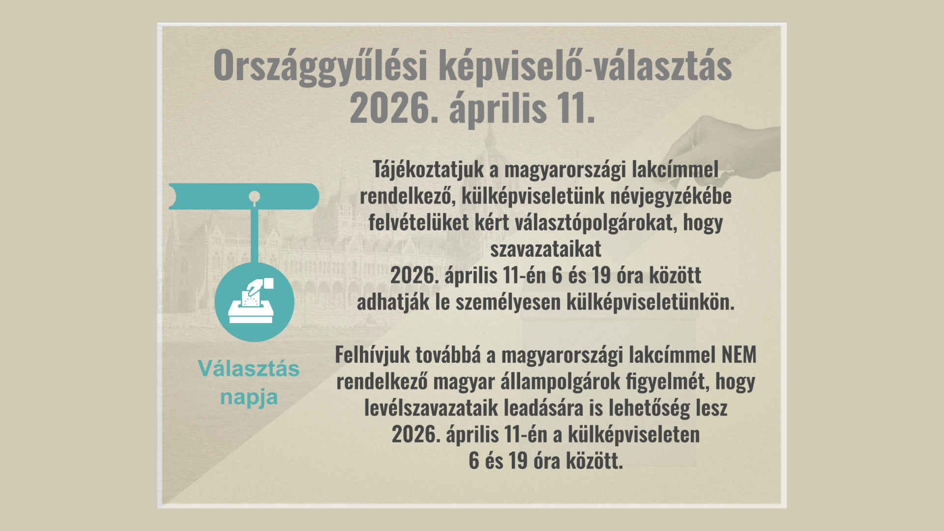 Magyarországi lakcímmel rendelkező, szavazóköri névjegyzéken szereplő választópolgárként, amennyiben külképviseleten kíván szavazni az adott választás tekintetében, külképviseleti névjegyzékbe vételi kérelmet nyújthat be 2026. április 2-án 16.00 óráig.